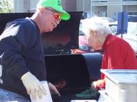 With the first rays of dawn they set up for a day of cooking. When all was set and fires lit, they all joined together for breakfast provided by Morrison’s Senior Dining. After breakfast it was time to get down to business, after all, they were there to cook. Chicken and ribs were seasoned and cared for by the cooks, just as if this were the American Royal or the Jack Daniel’s Cookoff. (Not just enough for a competition, but enough to feed the whole community of over 200 residents).